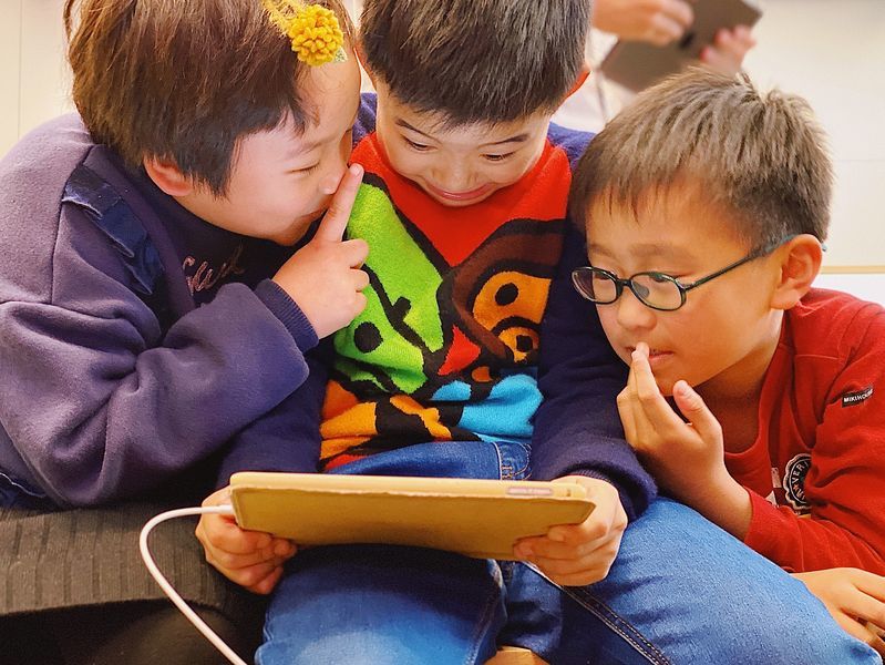 “Vita君”(右一)在上海一家苹果零售店内和其他小朋友在互动游戏中探讨编程概念。(受访者供图)