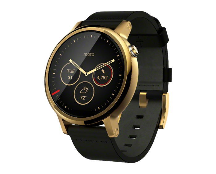 新款摩托罗拉手表延续了 Moto 360 的经典圆形表盘设计,内建1.2英寸360×360 OLED触摸屏,圆形表面设计,手表侧面提供两个按钮,上方按钮可以用作滚轮使用,便于在Wear OS界面中上下滚动操作。搭载高通 Snapdragon Wear 3100 处理器,配备1GB内存+8GB存储,运行谷歌Wear OS系统,兼容安卓5.0及以上版本和iOS 10及以上版本的手机使用。集成GPS和NFC(后者用于移动支付)以及心率监测器,支持always on display,支持快充,1小时即可充满电,省电模式下可使用长达3天,具有3ATM防水功能。提供黑色不锈钢。银色、金色三种配色选择,并支持更换表带。