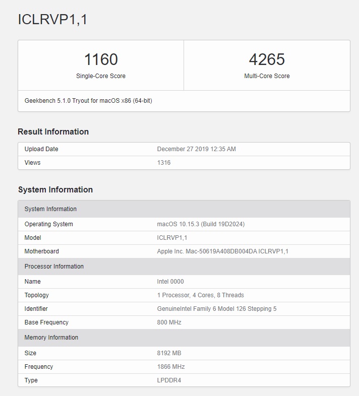 在Geekbench 5上,这款MacBook搭载了macOS 10.15.3系统,从型号“ICLRVP1,1”就可以确定是Intel Ice Lake处理器。这款处理器为4核8线程,主频为800MHz,搭载了8GB的LPDDR4内存。