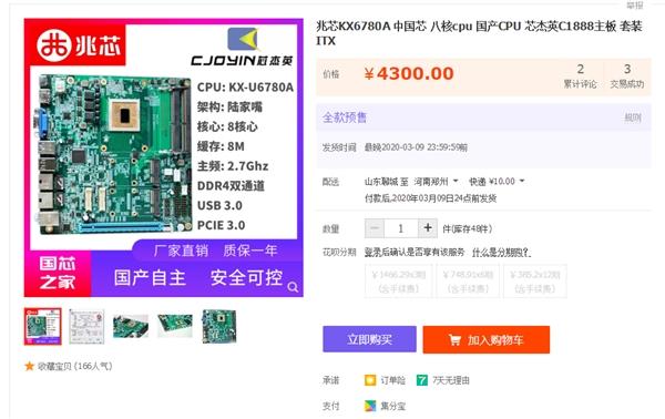KX-6000系列从2018年就开始说上市,不过这款处理器拖到了去年6月份才正式发布,最近才开始有实物——国产主板品牌深圳芯杰英(Cjoyin)开发出了一款搭载兆芯开先KX-U6780A的主板“C1888”,面向高端PC市场,全款预售价约为4300元,不过开先KX-U6780A的实际频率还不到3GHz,这款型号频率最高2.7GHz。