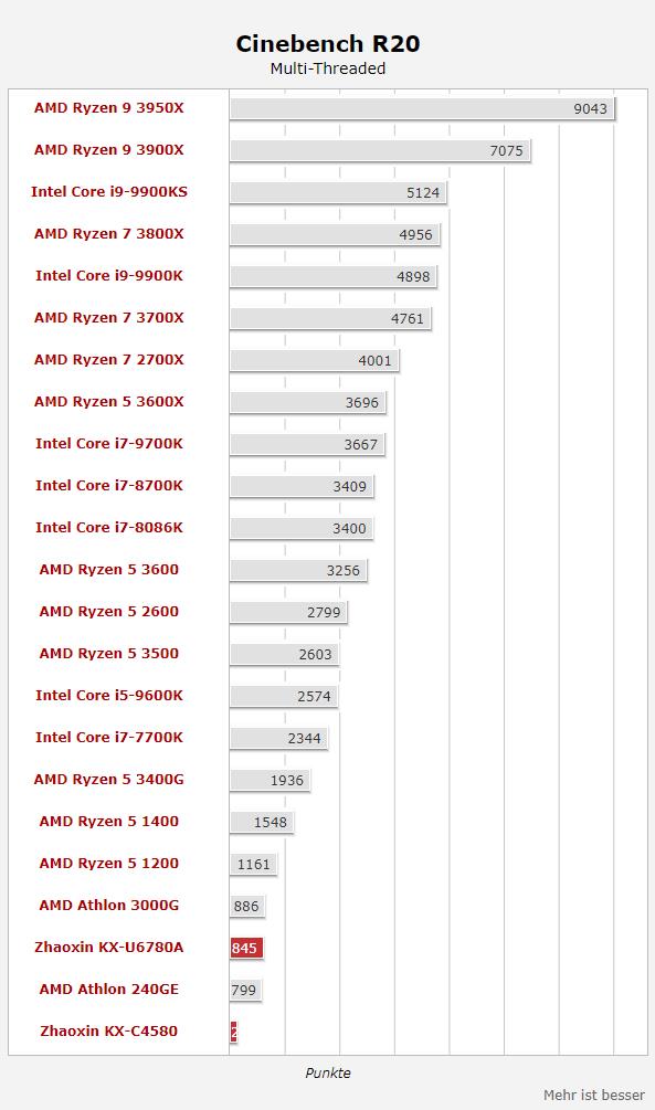 虽然二斤视频里没有横向对比其他处理器,不过Hardwareluxx网站汇总了CINBENCH R20的得分,跟其他AMD、Intel的处理器做了对比——开先KX-U6780A的多核845分性能接近AMD的Athlon 3000G,后者是一款14nm Zen架构、2核4线程、频率3.5GHz的处理器。