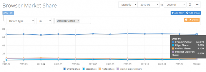 在浏览器方面,谷歌浏览器的市场份额略有下降。这款网络浏览器现在占有66.93%市场份额,其次是Mozilla Firefox,市场份额为8.12%。微软Internet Explorer和Edge浏览器市场份额分别是7.02%和6.60%,排名第三和第四。
