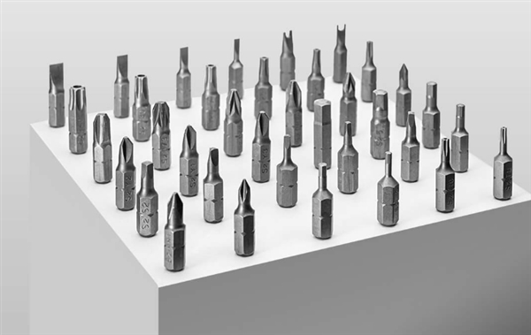 开创“弹夹式”收纳方案,节省空间,单次可置入12支常用批头。67mm超长输出轴,可探入细长狭窄空间,如机箱内部等。一套配齐36支批头,S2合金钢为高硬度工具钢,批头硬度达60hrc。