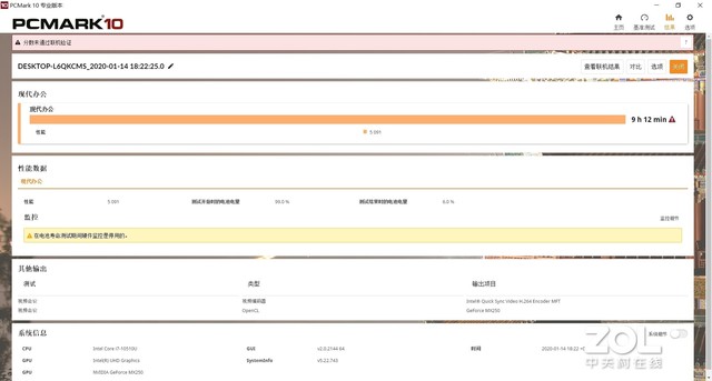 惠普战66三代内置了一块45Wh的电池,经过测试(PCMark 10现代办公,150cd/㎡亮度,开启WiFi),笔记本的续航时间为9小时12分钟,远高于同电池容量的续航水准,这也让笔记本具备了长时间无需插电使用的能力,为移动办公提供了基础保障。