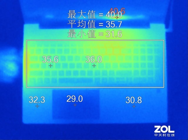 另外我们使用热成像仪对这款机器的C面温度进行了测试,可以看到其键盘区域最高温度为40℃,最低31.6℃,平均只有35.7℃,和正常体温相差无几,所以在实际体验时只会感觉到略微的温热,不会感觉烫手。另外,目前业界公认的C面温度标准为42℃,超过这个温度就是不合格的散热设计,所以惠普战66三代40℃的最高温度完全符合业界标准,说明其散热表现非常不错,能够给用户带来极佳的使用体验。