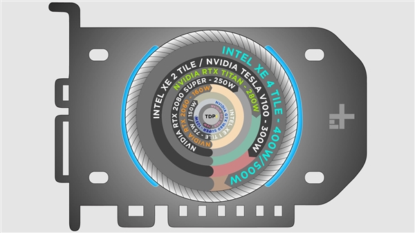 具体到Xe,似乎采用了一种瓦片式小芯片的设计,每片瓦具备128个执行单元(EU),四片式结构(Foveros 3D封装)的高端产品热设计功耗最高可达500W,要知道,NVIDIA目前最顶级的RTNX TITAN不过280W热设计功耗。